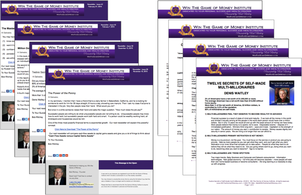 Over the next two years, you will receive a weekly, information-packed newsletter consisting of a combination of eBooks, special reports, and summaries of some of the greatest books written on financial and personal success.