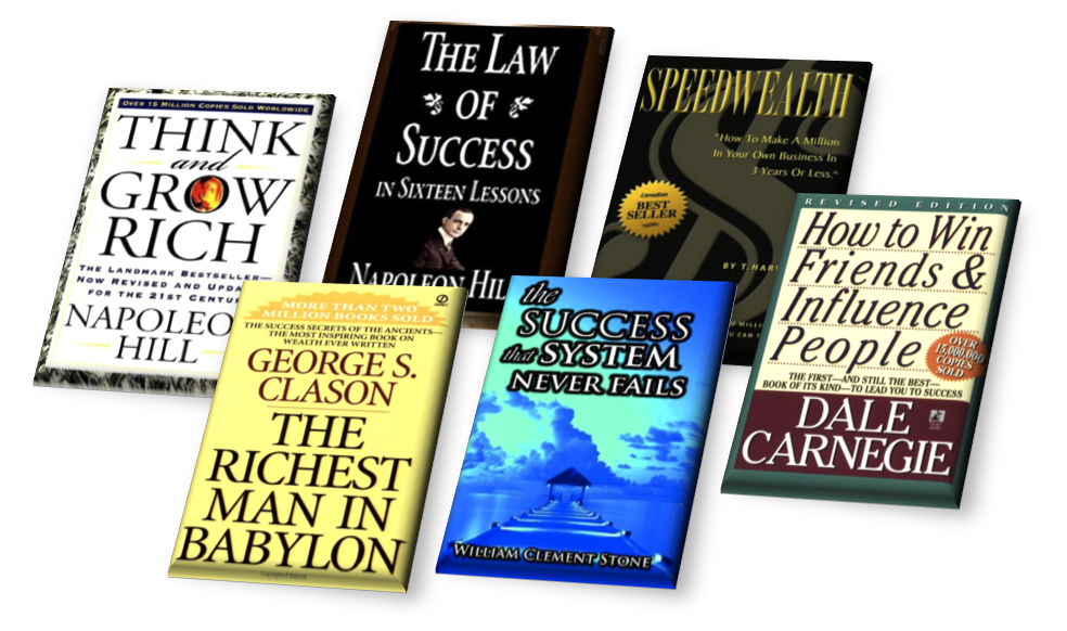 Books such as Think and Grow Rich, The Laws of Success, the Richest Man in Babylon, How to Win Friends and Influence People, The Success System That Never Fails, Speed Wealth, and much, much more.